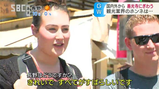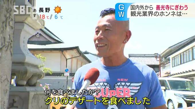 「(どちらから?)ホンコン」「(何食べた?)クリのデザートを食べました。モンブラン」「オーストラリアから来ました」「(長野はどう?)きれいで全てが素晴らしい!自然も善光寺も」