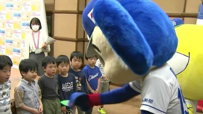 「ドアラ」からキャップをプレゼントされる子どもたち。名古屋市役所で5月1日、この春、名古屋市内の小学校に入学した7人に、中日ドラゴンズのキャップが贈られました。3年前に始まった、「でらスポ名古屋」と呼ば…