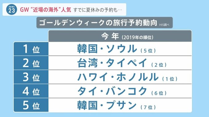 旅行会社大手のHISによると、ゴールデンウィークの海外旅行先で今年人気ナンバー1だったのが、韓国・ソウルでした。2位は台湾のタイペイで、コロナ禍前に1位だったハワイ・ホノルルは3位にランクダウン。今年は比較的近場の旅行先が人気を集めました。