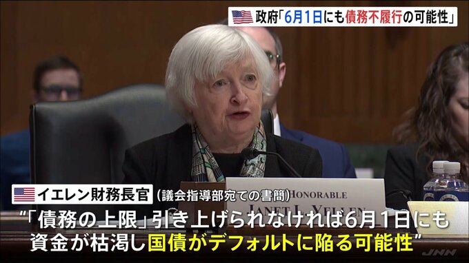 アメリカ政府が借金できる額を意味する“債務の上限”引き上げをめぐり、イエレン財務長官は、引き上げられなければ来月1日にもアメリカ国債がデフォルト=債務不履行に陥る可能性があるとの見通しを示し、議会の…