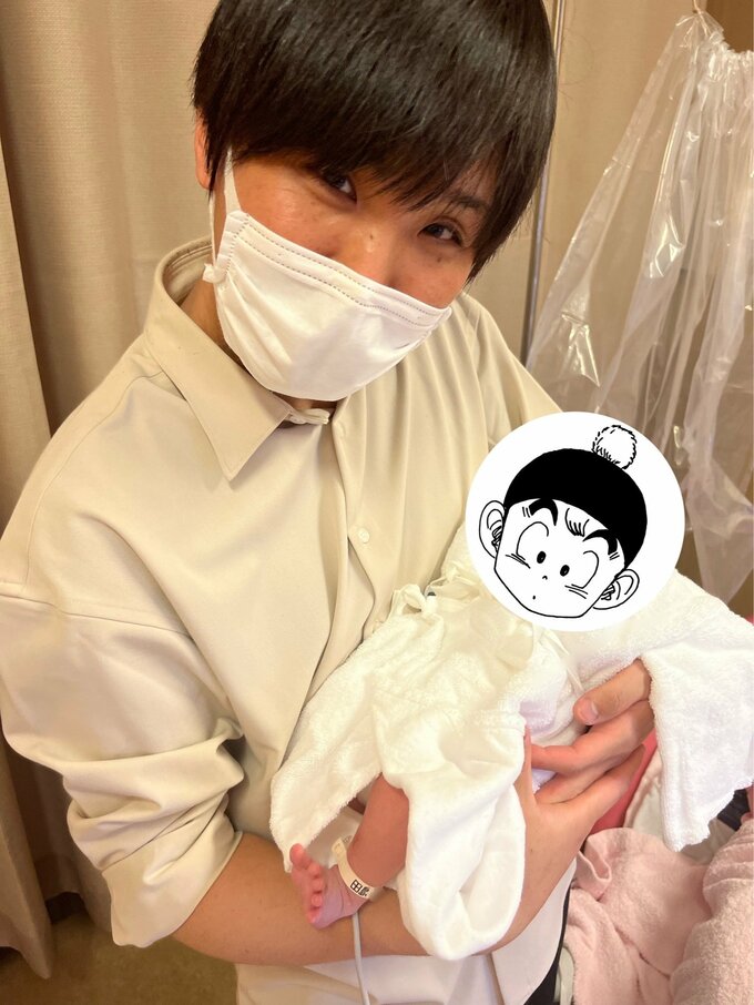田島さんは子どもの顔を似顔絵で表すと共に「オラの子が生まれたぞ!戦闘力3096グラムの男の子だ!」と、その喜びを綴っています。