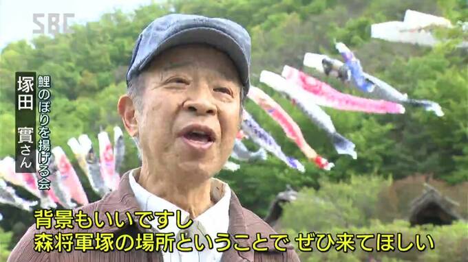 ■鯉のぼりを揚げる会・塚田實(つかだ・みのる)さん             「こいのぼりを見て昔を思い出してもらったり、背景もいいですし 森将軍塚の場所ということでぜひ来てほしいなと思っています」