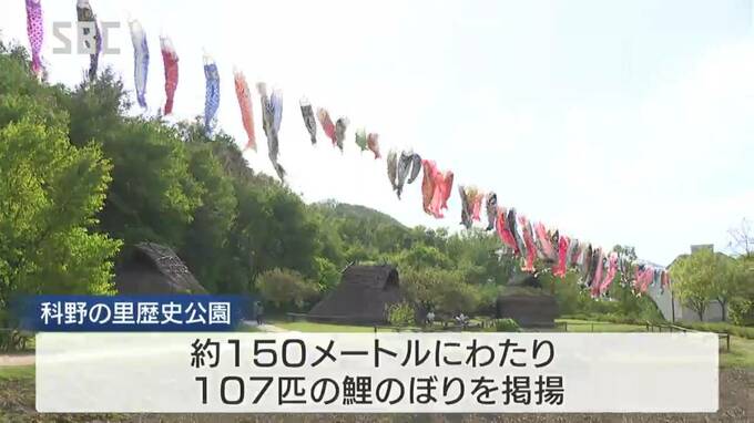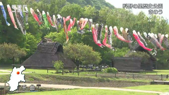竪穴住居など古墳時代の集落が再現された千曲市の科野(しなの)の里歴史公園に、およそ150メートルにわたって107匹のこいのぼりが掲げられています。