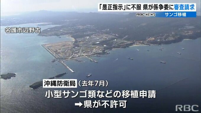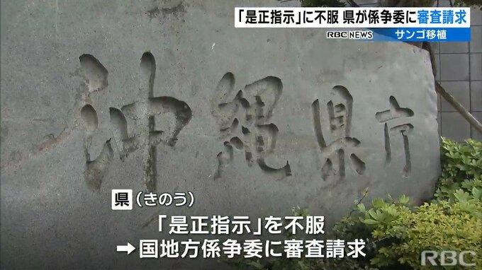 普天間基地の辺野古移設工事をめぐり、農林水産大臣が県に対しサンゴの移植を許可するよう求めた是正の指示を不服として県はきのう国の第三者機関に審査を申し出ました。