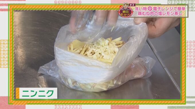 2.ショウガを千切り、ニンニクをみじん切りにし、塩、鶏ガラの素と一緒に先ほどの保存袋に入れる。※ニンニクはつぶしてみじん切りにすることでうまみが増す!