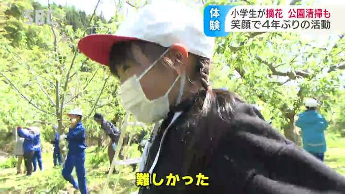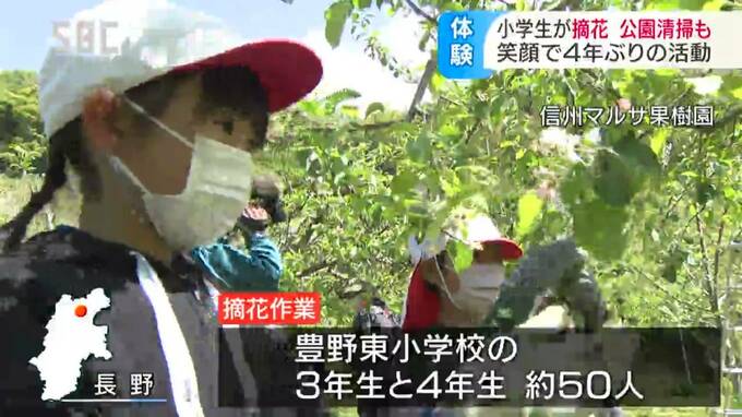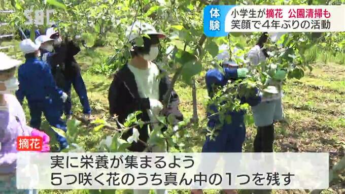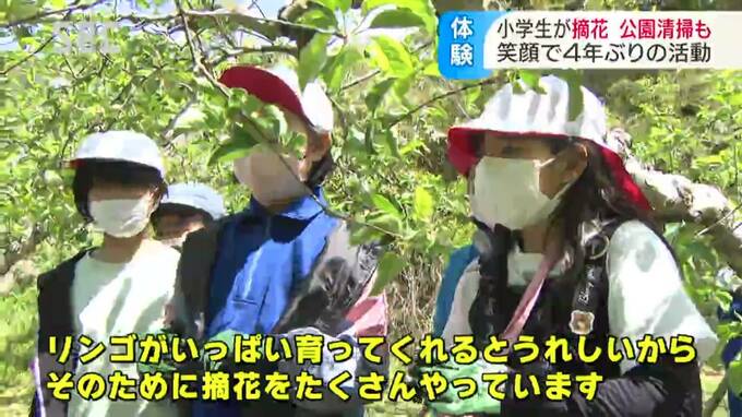 りんごの花を摘んだのは、長野市の豊野東(とよのひがし)小学校の3年生と4年生およそ50人で、きょうは遠足で信州マルサ果樹園を訪れました。