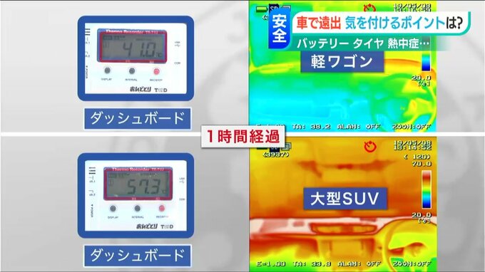 1時間でダッシュボード付近はおよそ60℃に、車内は45℃近くまで上がりました。