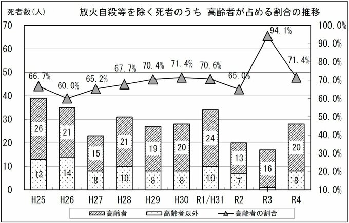 放火自殺等を除く死者のうち、65歳以上の高齢者が20人(71.4%)です。