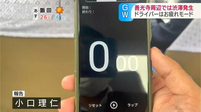「渋滞が発生しています。善光寺近くまでの所要時間を測ってみます」