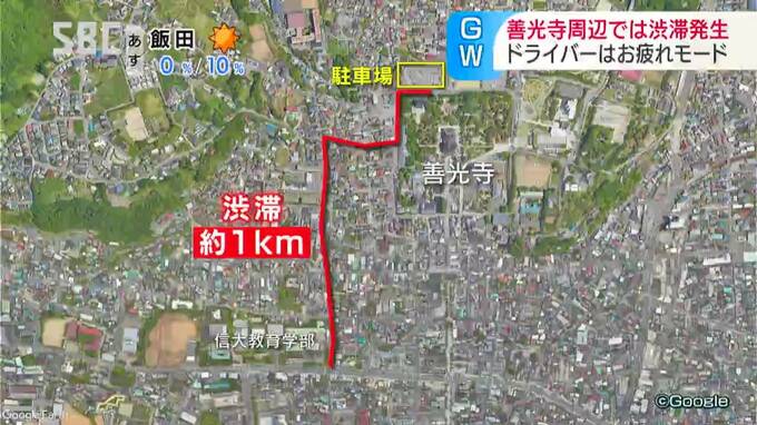 渋滞が発生していたのは長野市の信大教育学部近くの交差点から、善光寺北側の駐車場までのおよそ1キロ。