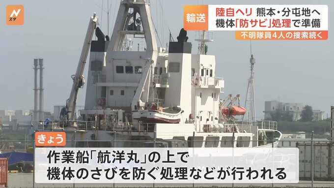 きのう、沖縄・宮古島付近の海から引き揚げられた陸上自衛隊のヘリ。「さび」を防ぐ処理など、所属する熊本県の分屯地に輸送するための準備が進められています。先月6日、消息を絶ち、きのう引き揚げられた陸上自…