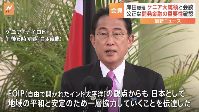 ケニアを訪問中の岸田総理は首脳会談を行い、日本が提唱する自由で開かれたインド太平洋の実現に向け、協力していくことを確認しました。岸田総理「FOIP(自由で開かれたインド太平洋)の観点からも、日本として、…