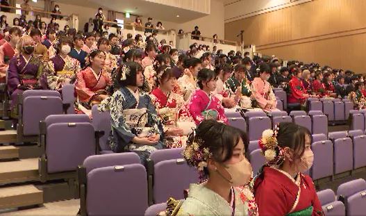 中野市の「二十歳を祝う会」は、豊田文化センターで開かれ、中野市出身の120人余りが集まりました。