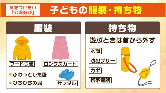 ーー子どもの服装や持ち物で何か気をつけることはあるのかを聞きました。すると、服装は、「フード付きの洋服」、「ロングスカート」、「サンダル」などは避けた方がいいとのことで、持ち物は、「水筒」「防犯ブザー」「鍵」「携帯電話」など、首から下げているようなものは、遊ぶときは外してくださいとのことです。