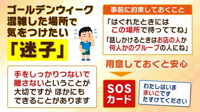 ーーゴールデンウィークは混雑した場所で気をつけたいのが「迷子」です。手をしっかりと繋いで離さないということも大切ですが、『事前に約束をしておくこと』例えばはぐれたときの集合場所を決めるとか困ったときに話しかける時は、お店の人や何人かのグループの人に話してねと、こういった声掛けをすることも有効ですよということです。『すいません迷子になったんです』ということを自分で言えるように約束事をしておくということです。そして用意しておくと安心なのがこの『SOSカード』というものなんだそうです。宮田さんこのカードはどういうものですか?