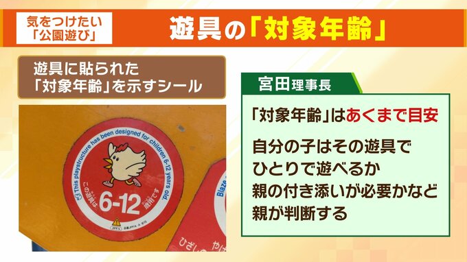 ーーまた遊具によっては対象年齢が示されているものもあります。取材に行った公園では滑り台に貼られていたものには、6歳~12歳用ですと書かれていました。こうしたものも含めてどのような点に気をつければいいでしょうか?