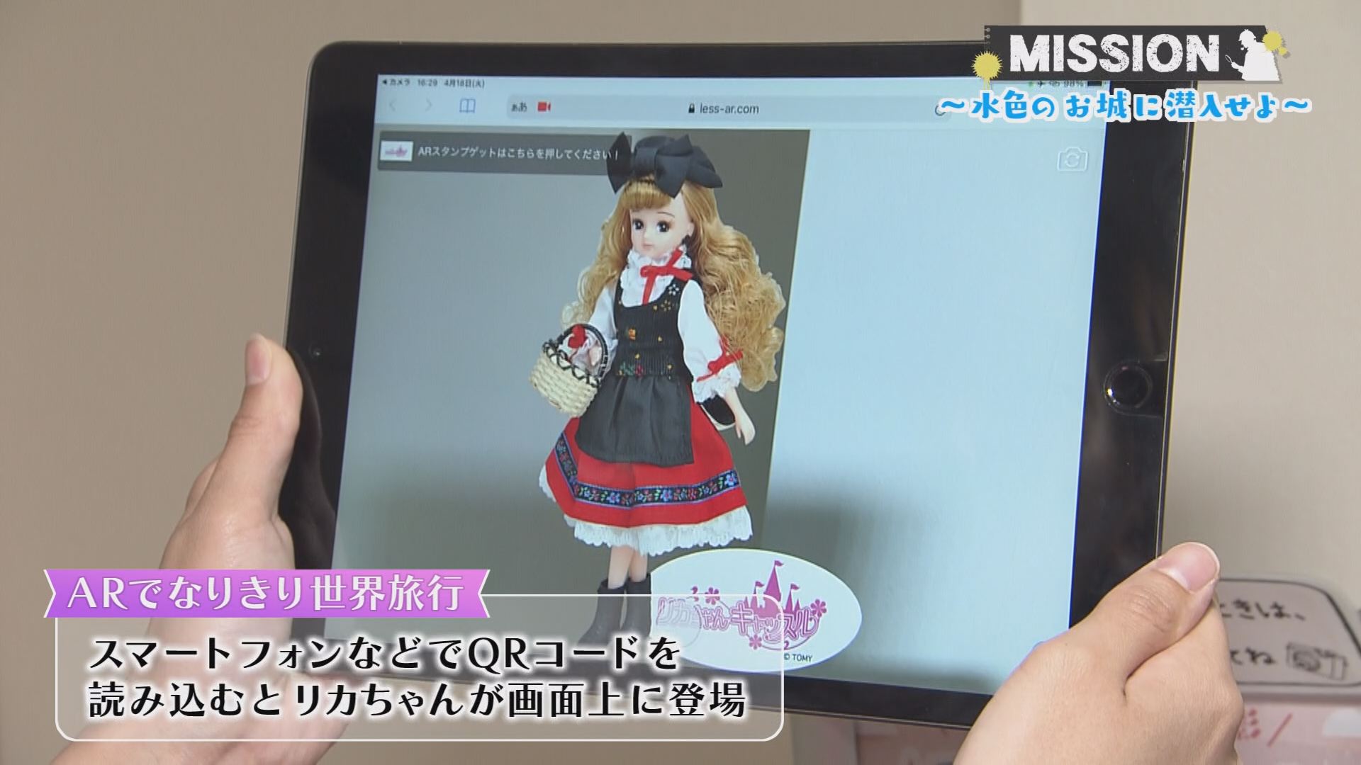 続いてやってきたのは、何やらハイテクなコーナー。スマートフォンなどでQRコードを読み込むと、画面上にリカちゃんが登場します。そしてなんと、一緒に写真を撮ることができるんです。仕上がりはこんな感じ。色々な背景があるので、リカちゃんと一緒に旅をしている気分になれそうです。さらに・・・。