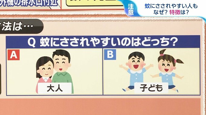 長島教授によりますと「蚊には人間を探し出すセンサーがある」とのことで、子どもは新陳代謝が活発で、『汗』や『高い体温』など、蚊が感知しやすいサインを皮膚から出しているため、大人よりも子どもの方に蚊が近寄っていく、というわけなんです。