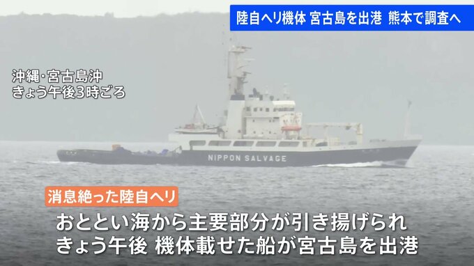 先月6日、陸上自衛隊のヘリコプターが沖縄県宮古島の周辺で消息を絶った事故で、おととい、海から引き揚げられたヘリの機体を載せた船が、きょう午後、宮古島の港を出港しました。ヘリの機体は所属部隊が拠点を置…