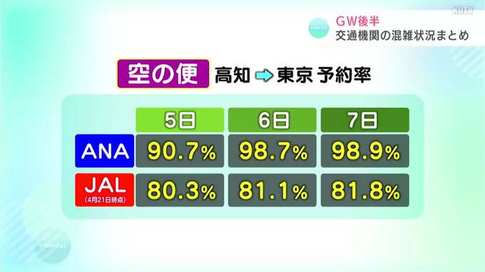 最大9連休となった今年のゴールデンウィーク。折り返しとはなっていますが、まだ連休は続きます!後半の交通機関の混雑状況をまとめました。まずは空の便です。高知発、東京行きは明日からがピークとなっていて全…