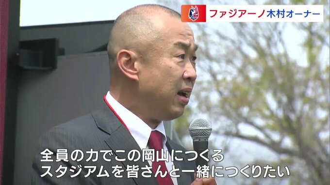 「最低2万5千人収容のサッカースタジアムです。全員の力でこの岡山に作る、スタジアムを皆さんと一緒に作りたいと思います。ぜひよろしくお願いいたします」