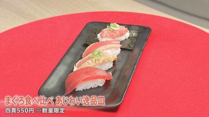 なかでもイチオシなのが、とろける脂が絶品のマグロの王様「本マグロ」など4種類を食べ比べできる「まぐろ食べ比べ あじわい逸品皿」(4貫550円※数量限定)。かっぱ寿司史上初となるマグロの“揚げたたき”は、外はサクサク、中はレアと、新たな食感が味わえます。