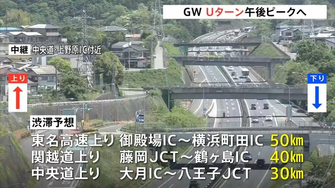 ゴールデンウィーク後半3日目、高速道路ではきょうも各地で渋滞が起きています。Uターンラッシュはきょう午後がピークとなりそうです。午前11時現在の渋滞は▼関越道下り高坂サービスエリア付近で22キロ、▼東名下…