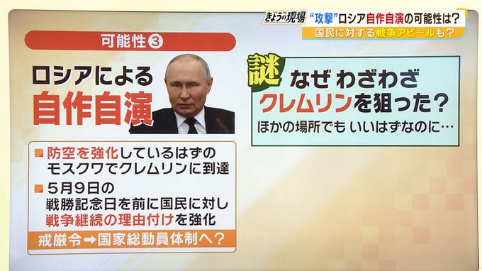 ――もう一つの可能性はロシアによる自作自演ということです。5月9日の戦勝記念日を前に国民に対し、戦争継続の理由づけを強化、戒厳令を出して出しているのですが、国家総動員体制に移るのではないかということです。なぜわざわざクレムリンを狙ったのかが不可解だなということですね。