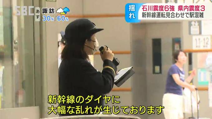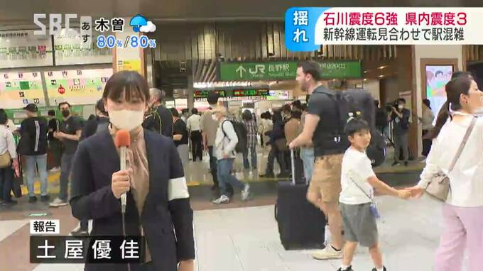 「JR長野駅です。地震の影響で新幹線が遅れているため、改札口前は多くの人があふれています」