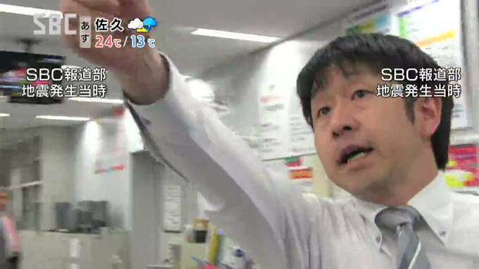 「長野市問御所にあるSBC6階の報道部のフロアです。看板が揺れています。テーブルなどにある荷物は崩れていませんが、看板が揺れています」