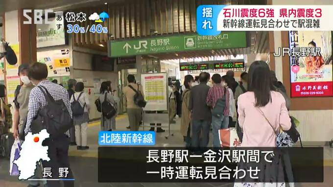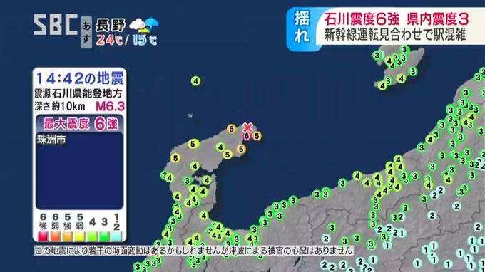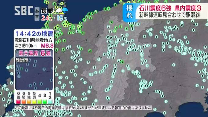 午後2時分42分ごろ、石川県で震度6強を観測する地震があり、長野県内でも8つの市町村で震度3を観測しました。