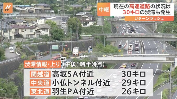 ゴールデンウィーク後半に入り、各地の高速道路では上りを中心に渋滞がつづき、Uターンラッシュとなっています。東名高速道路を走行中の桝本記者に伝えてもらいます。日本道路交通情報センターによりますと、午後5…