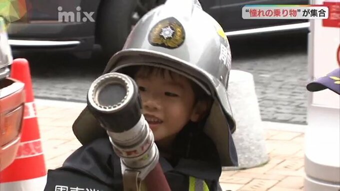 特に人気だったのが、消防車。こどもたちはミニユニフォームを着て、実際に現場で使われているホースの先端部分を持ち、写真撮影をしました。