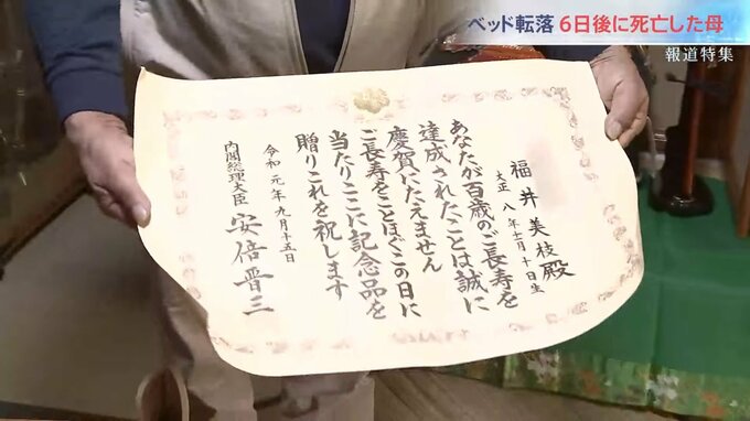 福井清美さん「これは母が100歳のときに総理からいただいた賞状。ギネスに載るんじゃないかというほど元気だったんですけどね…」