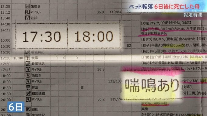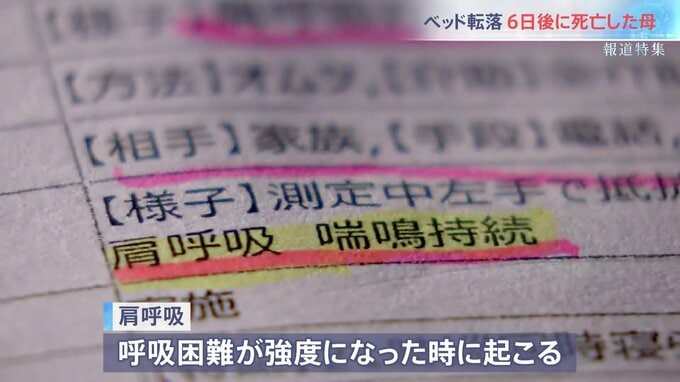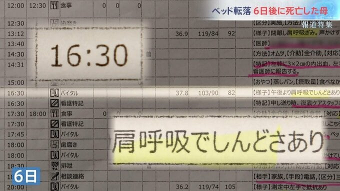 ベッドから転落した翌日の6日13時12分「肩呼吸ぎみ」。さらに、16時30分には「肩呼吸でしんどさあり」と記録されている。