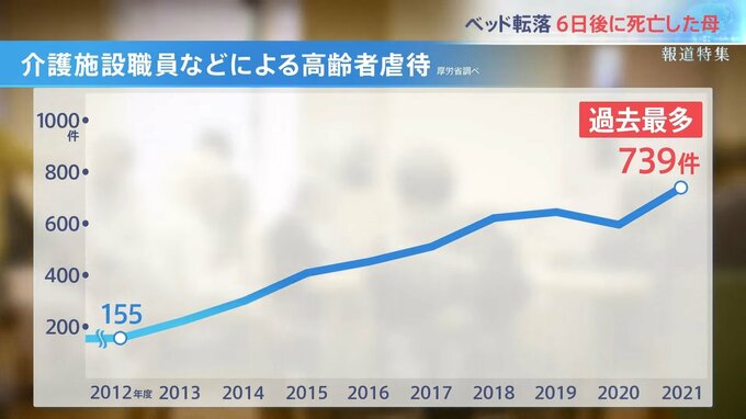 高齢者が介護施設の職員などから虐待を受けたとされる件数は、2021年度に全国で739件。この10年で約5倍になり、調査開始以来、過去最多になった。