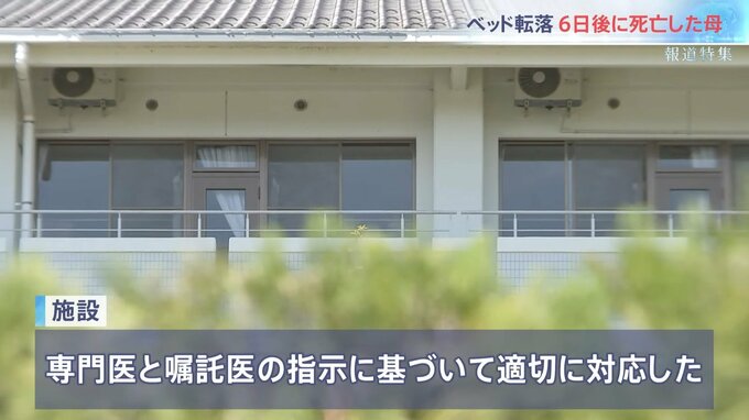 施設のコメント「専門医と嘱託医の指示に基づいて適切に対応しました。虐待にあたるような放棄・放任は行っていません。美枝さんをベッドから転落させてしまったことは申し訳ないと思っています」