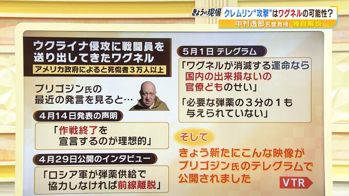 モスクワ・クレムリンへのドローン攻撃。ロシア側の「アメリカも関与した」との批判に対し、アメリカ政府は「一切関与していない」と説明。ウクライナのゼレンスキー大統領も関与を全面的に否定しています。筑波大学名誉教授・中村逸郎氏は、攻撃はウクライナでもロシアでもなく、「ロシアの民間軍事会社ワグネルによるものである可能性がある」と考察します。さらにワグネル創設者であるプリゴジン氏の“プーチン大統領への恨み”と今後の狙いについて解説します。