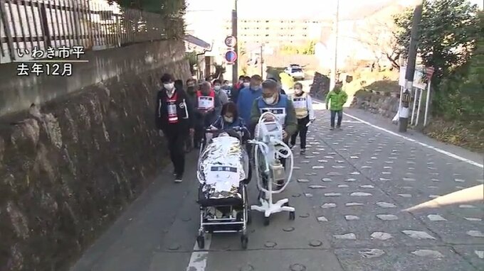 去年12月のいわき市平。急こう配の坂道を、バギーと呼ばれる車いすと呼吸器をつけた台車を押して進む人たちがいました。