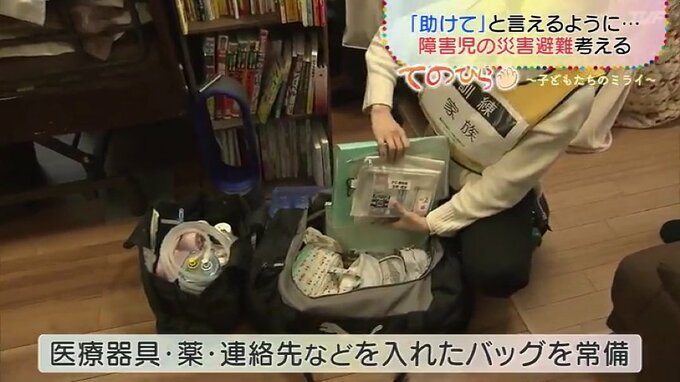 災害に備え、笠間家では医療器具や薬、連絡先などが入ったバッグを常備しています。こうした日常を初めて見る参加者も少なくありません。