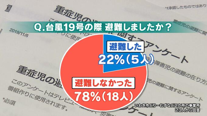 台風19号の後、JNNが「どりーむず」などを利用する、重症児の保護者にアンケート調査をおこなったところ回答した人のうち、8割近い人が避難をしていませんでした。理由として半数近い人が「避難所でほかの避難者に迷惑がかかるから」と答えています。