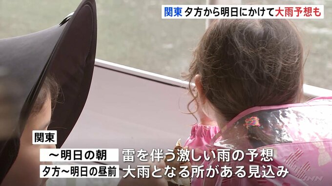 関東地方は、きょう夕方から明日の昼前にかけて大雨となるところがある見込みです。気象庁によりますと、前線や低気圧に向かって暖かく湿った空気が流れ込む影響で、関東地方では明日の朝にかけて雷を伴う激しい雨…