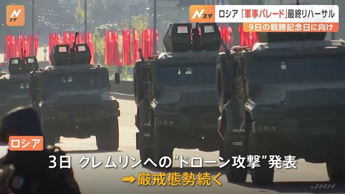 ロシアで最も重要とされる9日の対ドイツ戦勝記念日を前に、モスクワで7日、軍事パレードのリハーサルが行われました。3日にはクレムリンへの“ドローン攻撃”が発表され、厳戒態勢の中で迎える形となっています。…