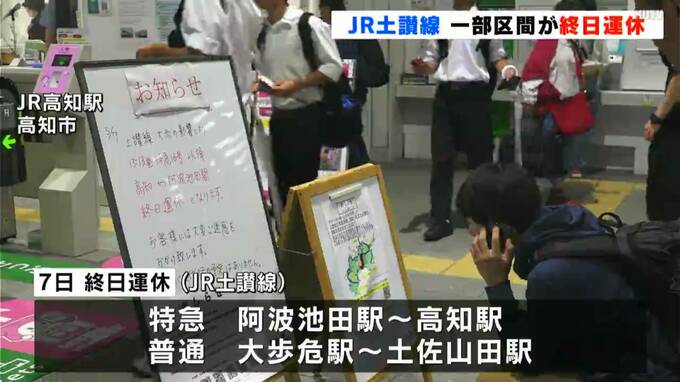 大雨の影響で、JR土讃線は7日の午後から、一部の区間が、終日運休となっています。繁藤駅に設置している雨量計が、規制値を超える見込みがあることから、JR土讃線は特急列車が阿波池田から高知の間で、普通列車が…