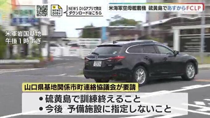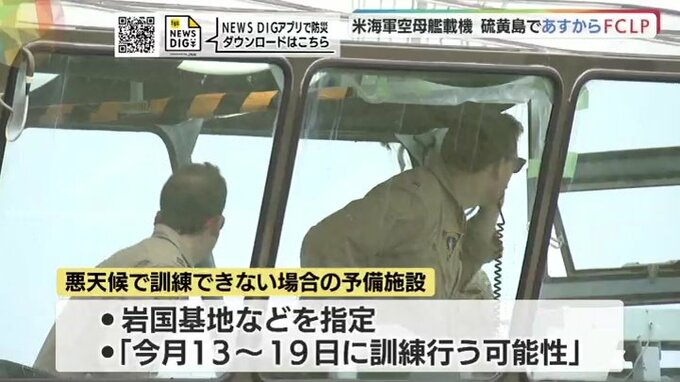 悪天候などで硫黄島で訓練が出来ない場合、岩国基地など4つの基地を予備施設に指定し、今月13日から19日の間に訓練を行う可能性があるとしています。