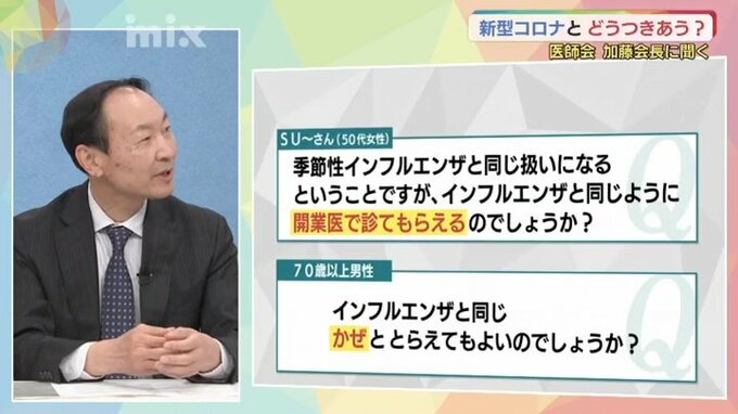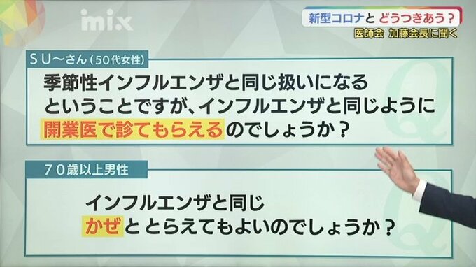 まずは「季節性インフルエンザと同じ扱いになるということですが、インフルエンザと同じように開業医で診てもらえるのでしょうか?」(SU~さん、50代女性)「インフルエンザとおなじ風邪ととらえても良いのでしようか」(70歳以上男性)