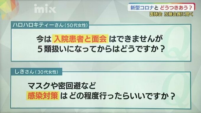 8日から、新型コロナが5類に移行されました。きょうは視聴者の皆さんから新型コロナに関する疑問を募集し、このうち一部を山口県医師会の加藤智栄会長に聞きたいと思います。