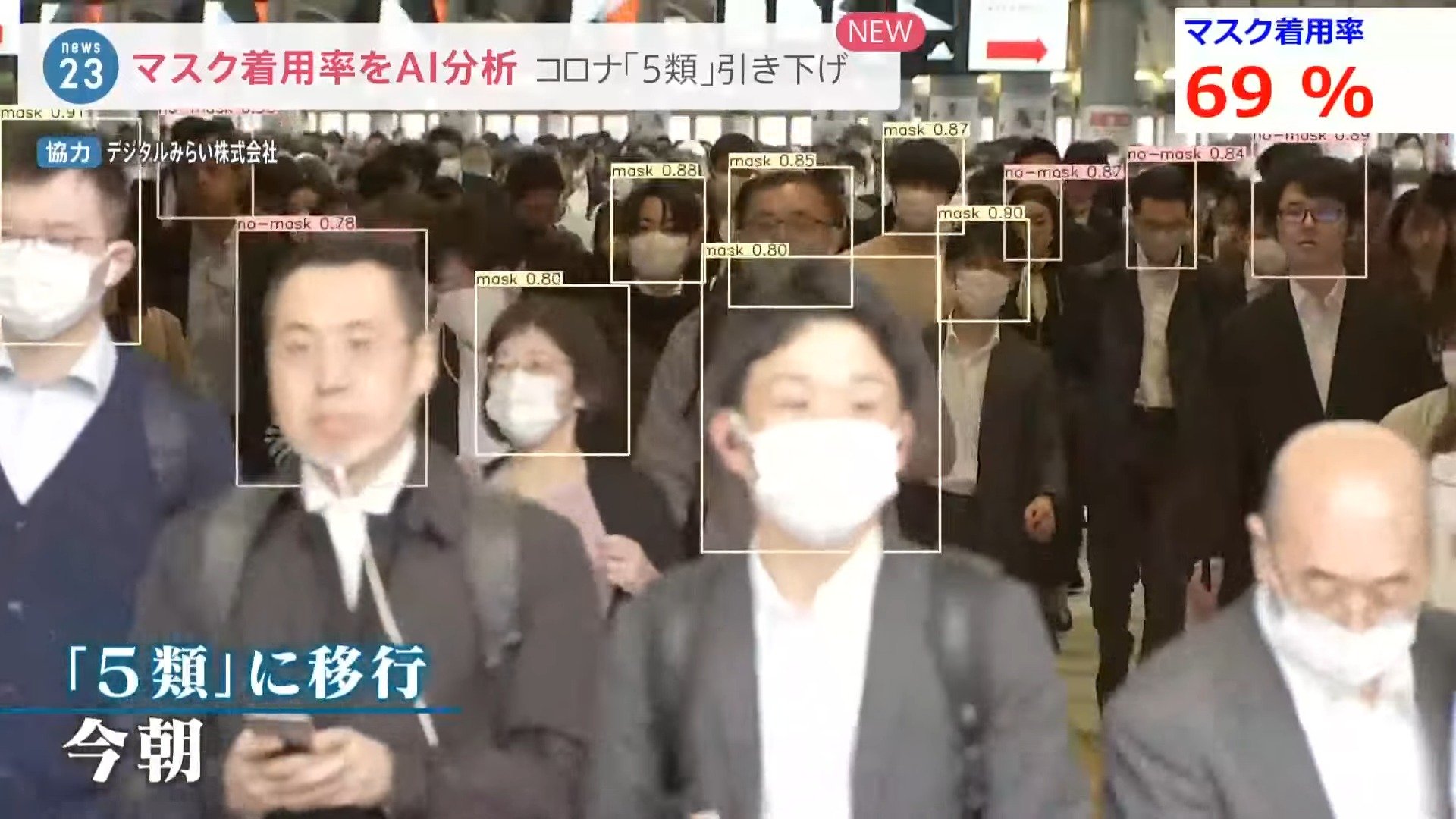 そのマスク着用率について、東京・品川駅の通勤風景の“過去といま”をAIで分析しました。