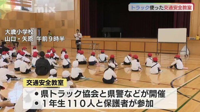教室は、山口県トラック協会が山口県警などと開いたもので大歳小学校の1年生およそ110人と保護者が参加しました。