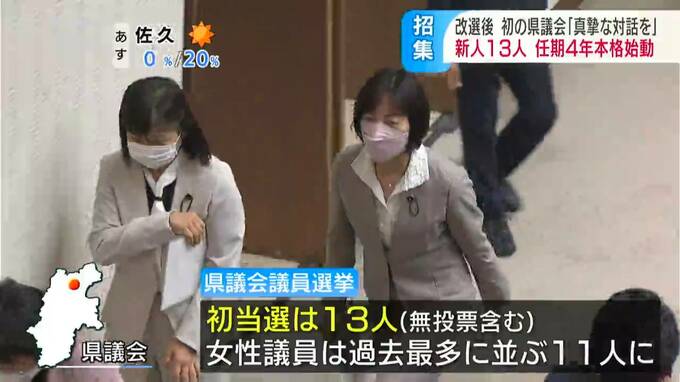 今回の県議選では定数57のうち無投票を含めて13人が初当選し、また、女性議員は過去最多に並ぶ11人が当選しました。